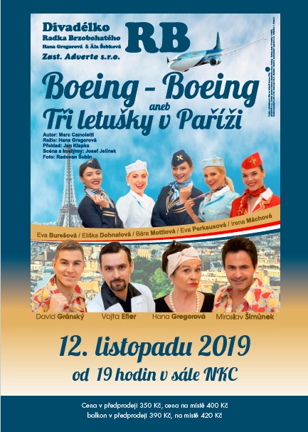Zveme vás do Novostrašeckého kulturního centra na divadelní představení Boeing aneb tři letušky v Paříži, které se koná 12. listopadu od 19 hodin. Vstupenky jsou v předprodeji za 350 Kč, v den konání za 400 Kč.