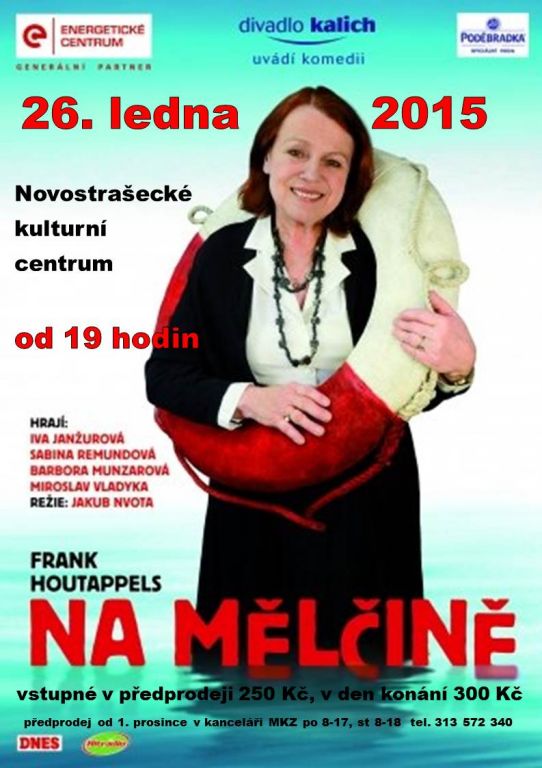 MKZ Nové Strašecí spolu s divadlem Kalich uvádí od 19 hodin tragikomedii Na mělčině. V hlavní roli Iva Janžurová a Miroslav Vladyka. Vstupenky v předprodeji 250 Kč, v den konání 300 Kč. Od 1. prosince v prodeji v NKC.