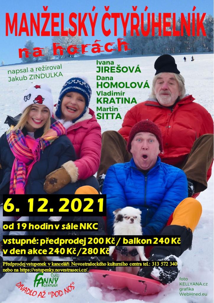 Divadelní představení od 19 h. Vstupenky z loňského roku na představení Vzhůru dolů zůstávají v platnosti na nově plánované představení Manželský čtyřúhelník na horách.