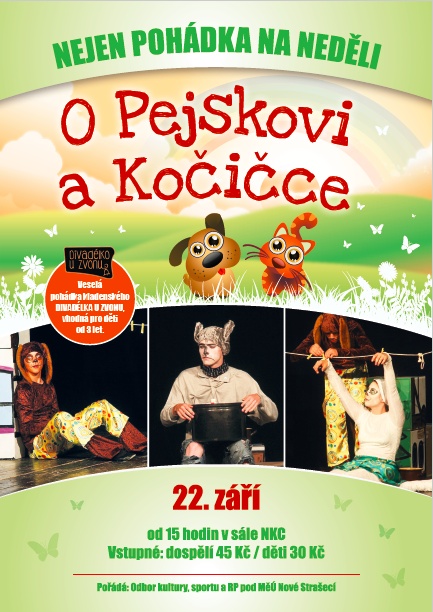 I po prázdninách se děti mohou těšit na nedělní pohádky v Novostrašeckém kulturním centru. Jako první uvedeme 22. září pohádku kladenského Divadélka u Zvonu O pejskovi a kočičce. Jedna z nejznámějších českých pohádek z pera Karla Čapka určitě potěší nejen naše nejmenší diváky. Uvidíte, jak pejsek a kočička myli podlahu, jak si sušili kožíšky a jak vařili dort. V pohádce zazní spousta originálních písniček, objeví se krásné kostýmy a povedená výprava.